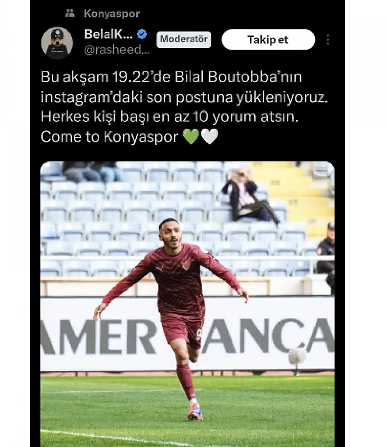 Konyaspor taraftarları daha önce ismi Anadolu Kartalı'yla anılan Bilal Boutubaa'ya, sosyal medya hesaplarından 'Come To Konyaspor' yorumları atıyor.