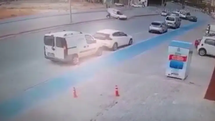 Görüntülerde, ara sokaktan çıkan aracın çarptığı otomobilin savrularak refüjdeki yayaya çarpması, otomobilin karşı şeride geçmesi ve şoka giren sürücünün kaldırıma oturması yer alıyor.