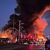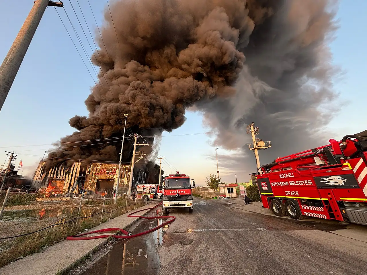 Yangın sebebiyle gökyüzünü siyah duman kaplarken, itfaiye ekiplerinin alevlere müdahalesi sürüyor.