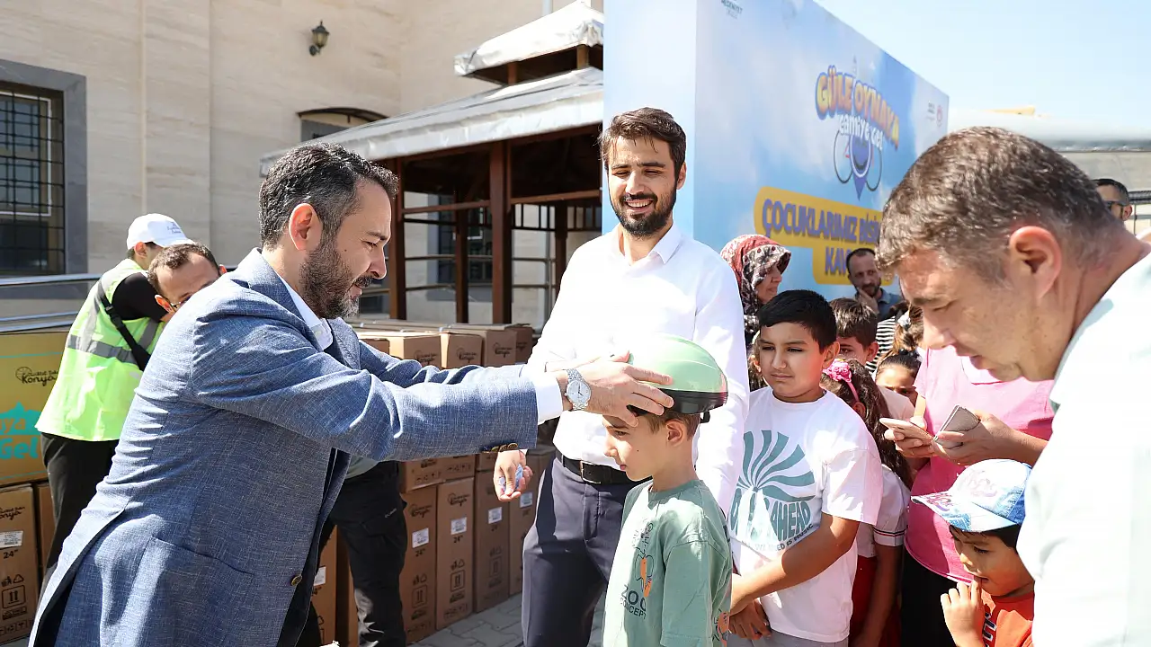 Konya Büyükşehir Belediyesi'nin 'Güle Oynaya Camiye Gel' projesi çerçevesinde şehir merkezinde hak sahibi çocuklara bisiklet dağıtımı sürüyor.