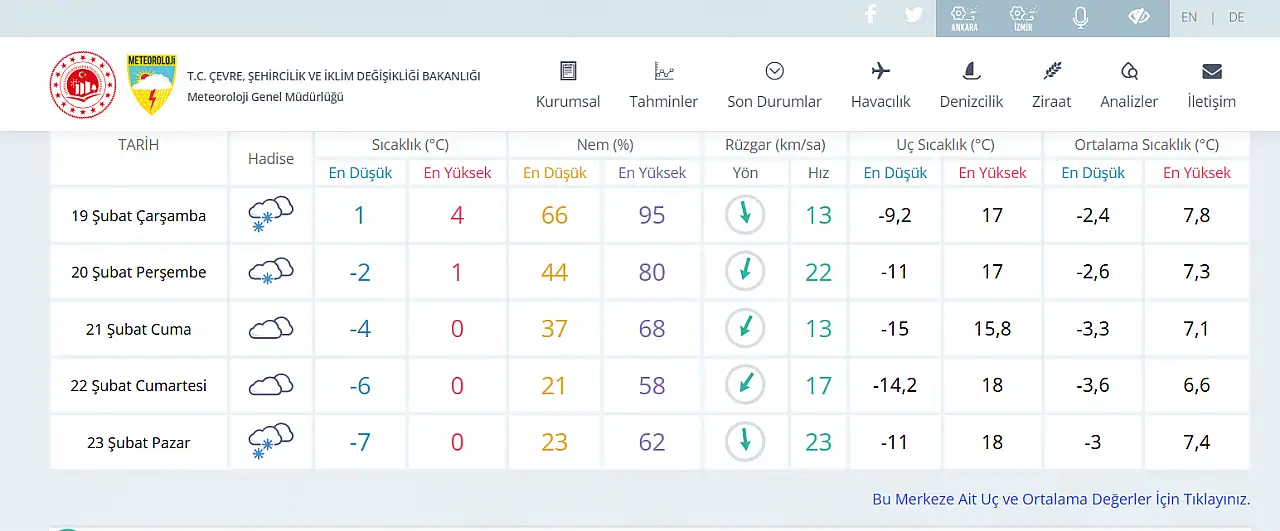 Kar yağışı tahminini 20 Şubat Perşembe günü içinde yineleyen Meteoroloji, 21 Şubat Cuma gününde ise, havanın -4 derece olacağını aktardı. Soğuk hava dalgasının haftanın son gününde de etkili olacağını ifade eden Meteoroloji, 23 Şubat Pazar gününde kar yağışının etkili olacağı ifade edildi.