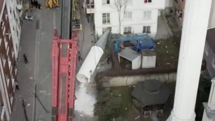 İstanbul'da bir camii minaresinde çalışmalar yapıldığı sırada halatın kopmasıyla minare bir binaya çarptı.