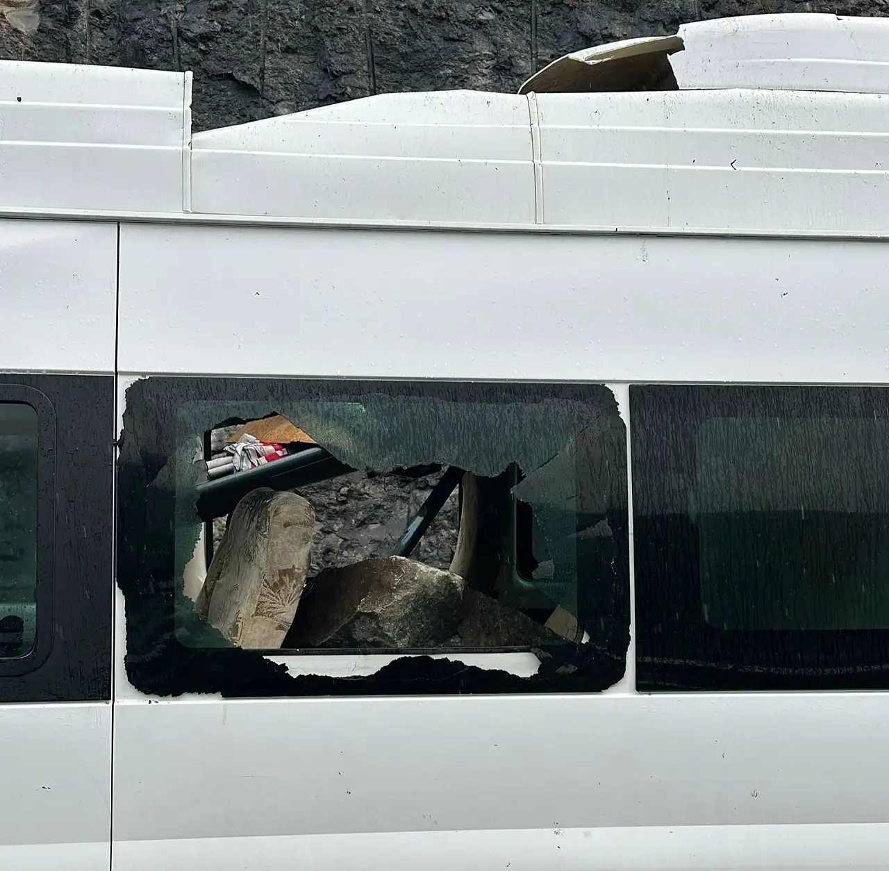Artvin istikametine ilerleyen minibüs, yamaçtan koparak yola savrulan dev kaya parçalarının hedefi oldu. Kayaların minibüsün tavanını parçalayarak araç içine girdiği, bir koltuğun üzerine düştüğü öğrenildi. Çarpmanın etkisiyle minibüs kullanılamaz hale geldi.