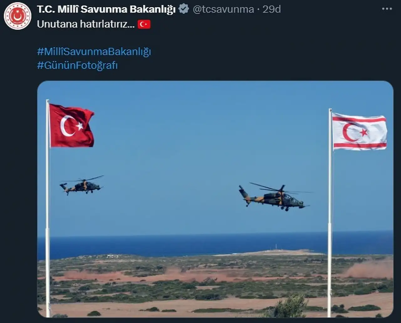 MSB, içerisinde KKTC ve Türk Bayrağı’nın bulunduğu bir fotoğrafı "Unutana Hatırlatırız" notuyla paylaştı. Ayrıca fotoğrafta bayraklar arasında, yerli imkanlarla üretilen, ATAK helikopterler de yer aldı.