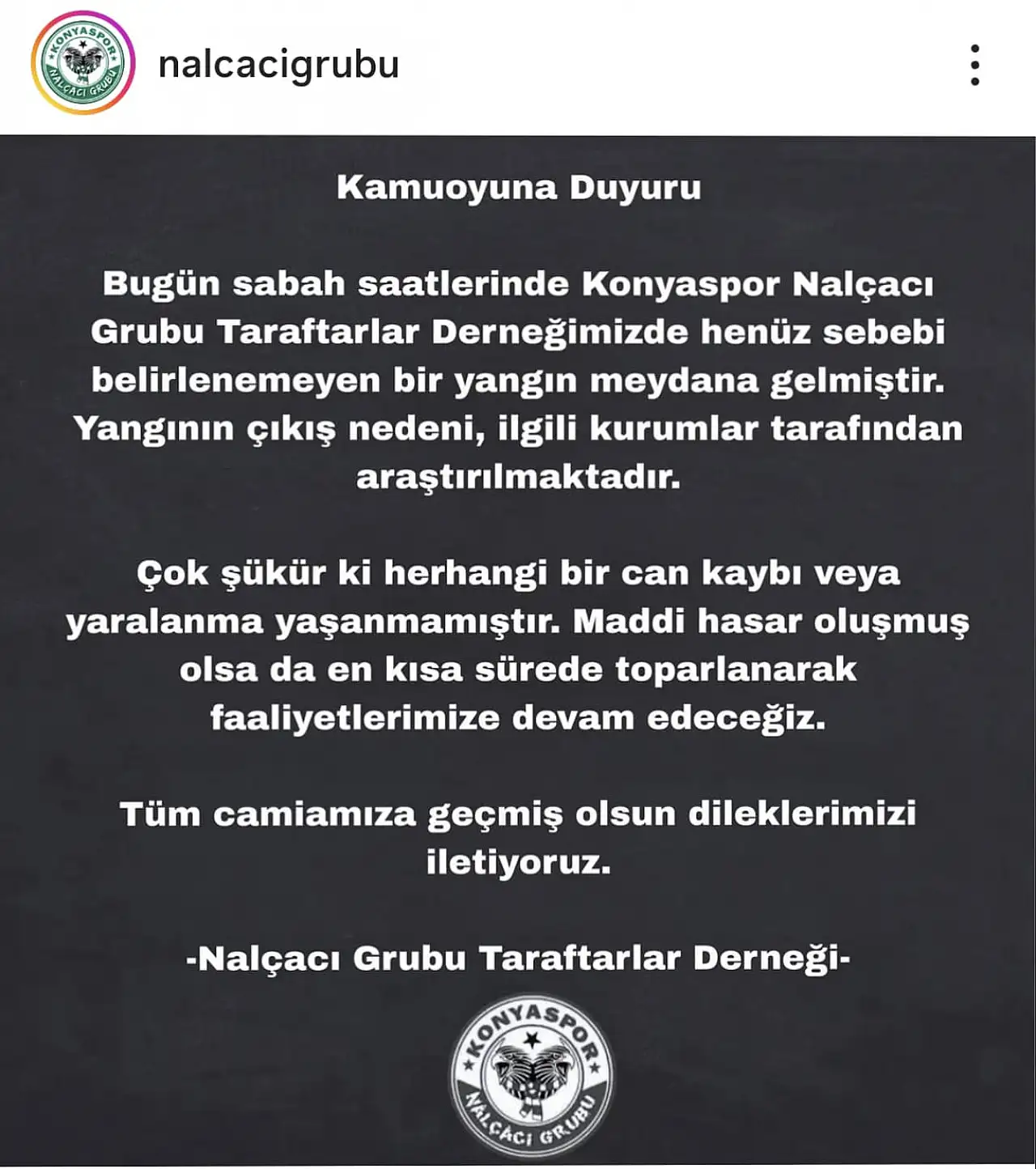 Konyaspor’un köklü taraftar oluşumlarından Nalçacı Grubu Taraftarlar Derneği, bu sabah talihsiz bir olay yaşadı. Henüz çıkış sebebi belirlenemeyen bir yangın, dernek binasında maddi hasara yol açtı.