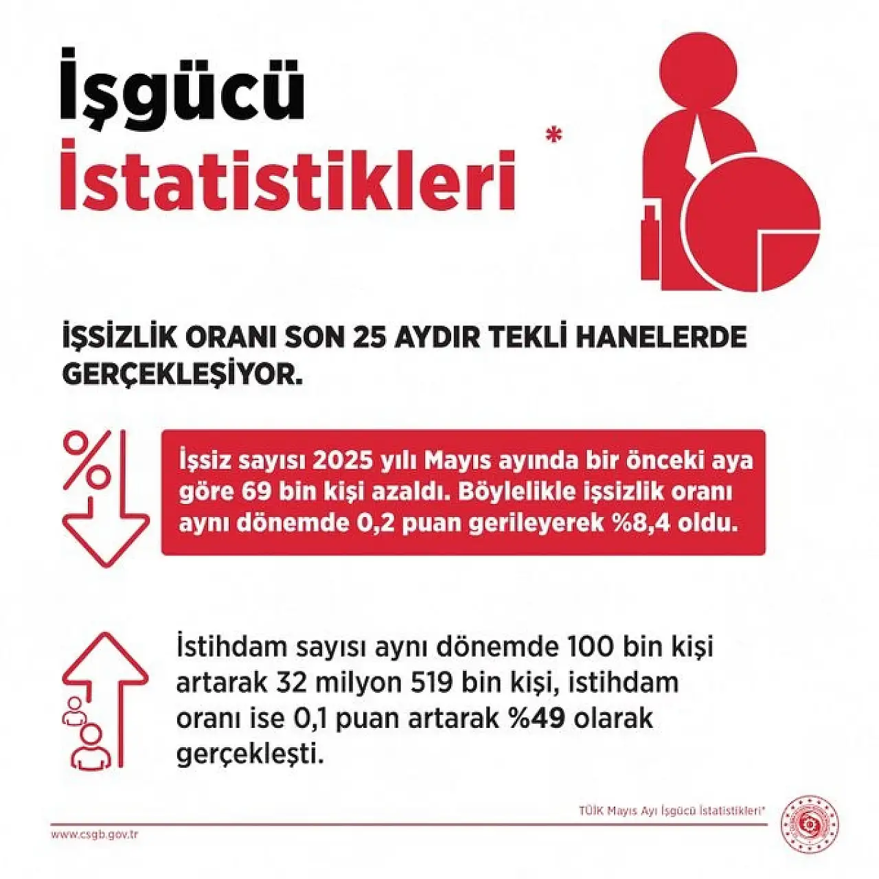 Çalışma ve Sosyal Güvenlik Bakanı Vedat Işıkhan, Türkiye İstatistik Kurumu’nun (TÜİK) mayıs ayı dış ticaret ve işgücü istatistikleri ile hizmet üretici fiyat endeksini açıklamasının ardından sosyal medya hesabından açıklamada bulundu. Yatırım, istihdam, üretim ve ihracat odaklı büyüme stratejilerinin işgücü verilerinde olumlu seyri devam ettirdiğini belirten Işıkhan, "Son 25 aydır tekli hanelerde gerçekleşen işsizlik oranı, bu yılın mayıs ayında bir önceki aya göre 0,2 puan azalarak yüzde 8,4 seviyesinde gerçekleşti. 69 bin kişi azalan işsiz sayısı, 2 milyon 972 bin kişiye geriledi. Genç nüfusta da azalan işsizlik oranı, aynı dönemde 0,3 puan gerileyerek yüzde 15,4 oldu" ifadelerine yer verdi.