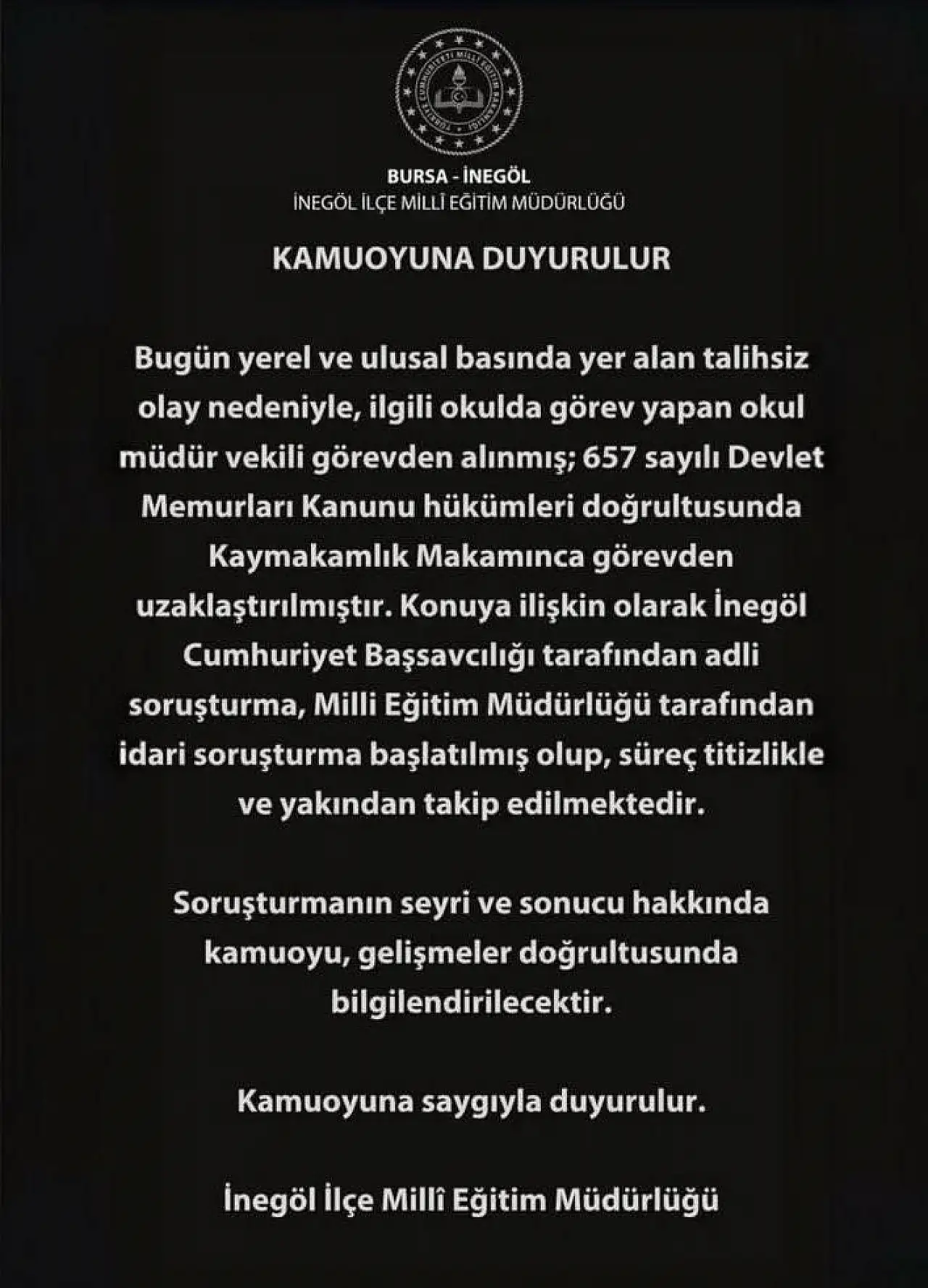 İlçe Milli Eğitim Müdürlüğü, yaptığı yazılı açıklamada, okul müdür vekilinin görevden alındığını belirtti. Açıklamada, “657 sayılı Devlet Memurları Kanunu hükümleri doğrultusunda kaymakamlık makamınca görevden uzaklaştırılmıştır. Konuya ilişkin olarak İnegöl Cumhuriyet Başsavcılığı tarafından adli soruşturma, Milli Eğitim Müdürlüğü tarafından idari soruşturma başlatılmış olup, süreç titizlikle ve yakından takip edilmektedir. Soruşturmanın seyri ve sonucu hakkında kamuoyu, gelişmeler doğrultusunda bilgilendirilecektir” denildi.