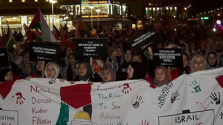 Konya’da binlerce kişi İsrail’in Filistin’e yönelik katliamlarını protesto etmek amacıyla sokaklara akın etti. Yürüyüş, Zafer Meydanı'ndan başlayıp, Mevlâna Meydanı’nda son buldu.