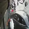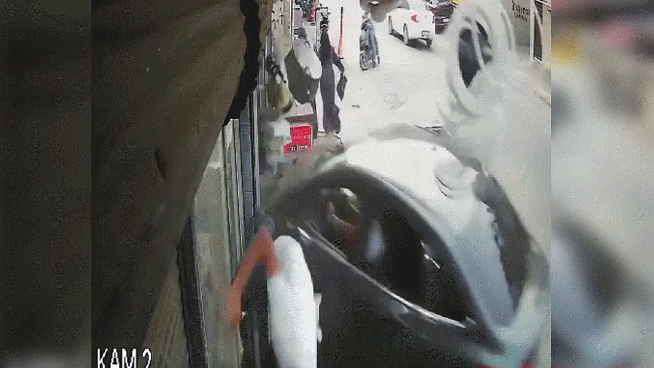 Kontrolden çıkan otomobil kaldırımda yürüyen H.B. (29)'yi kısmen çarpıp ardından markete daldı. Kaza anı anbean güvenlik kamerasına yansıdı. Kaza da sürücü ile birlikte 4 kişi yaralandı.