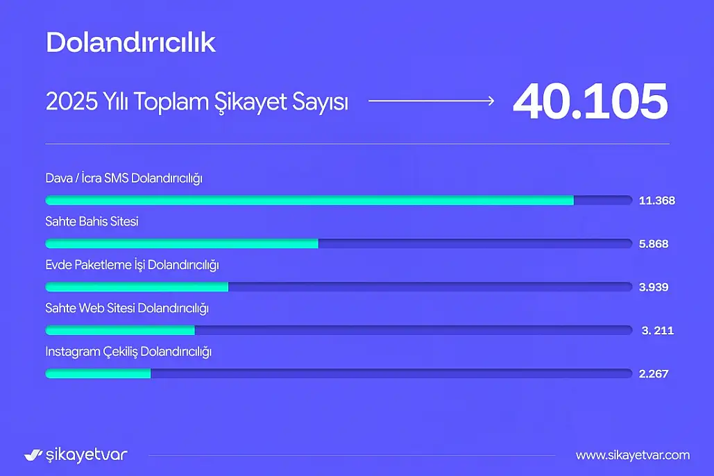 Türkiye'nin 2025'te en çok konuştuğu konular arasında dolandırıcılık vakaları da yer aldı. Son bir yılda platforma konuyla ilgili toplam 40 bin 105 şikayet ulaştı. Çeşitli yollarla kullanıcıları ağlarına düşüren dolandırıcıların kullandıkları yollar platforma yansıdı. 2025'te 'dolandırıcılık' alanında dava / icra SMS dolandırıcılığı yöntemi bir önceki yılla kıyaslandığında yüzde 162'lik artışla 11 bin 368 sayısını gördü. Sahte bahis sitelerinde yıllık şikayet artışı yüzde 67 oranında gözlemlendi ve şikayet sayısı 5 bin 868'e ulaştı. Evde paketleme dolandırıcılığı, sahte web sitesi dolandırıcılığı, Instagram dolandırıcılığı, kripto para yatırım dolandırıcılığı öne çıkan diğer yöntemler oldu.