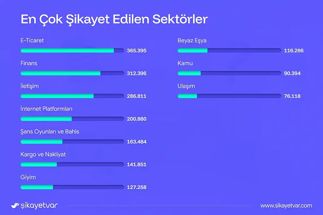 Şikayetvar'ın 2025 verilerine göre platforma 2,8 milyondan fazla başvuru yapılırken 533 bini çözüme ulaştı. En yoğun şikayet e-ticaret, finans ve iletişimde toplandı dolandırıcılık ve iade süreçleri tüketicinin en büyük sorunu oldu.