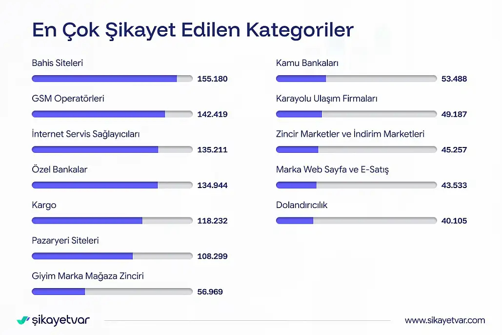 Şikayetvar'ın 2025 verilerine göre platforma 2,8 milyondan fazla başvuru yapılırken 533 bini çözüme ulaştı. En yoğun şikayet e-ticaret, finans ve iletişimde toplandı dolandırıcılık ve iade süreçleri tüketicinin en büyük sorunu oldu.