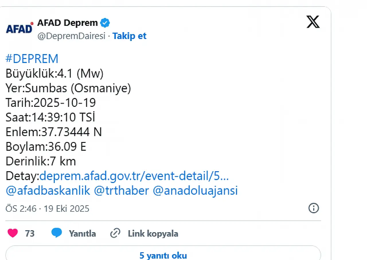 Afet ve Acil Durum Yönetimi Başkanlığı (AFAD), Osmaniye'de 4.1 büyüklüğünde deprem meydana geldiğini açıkladı.