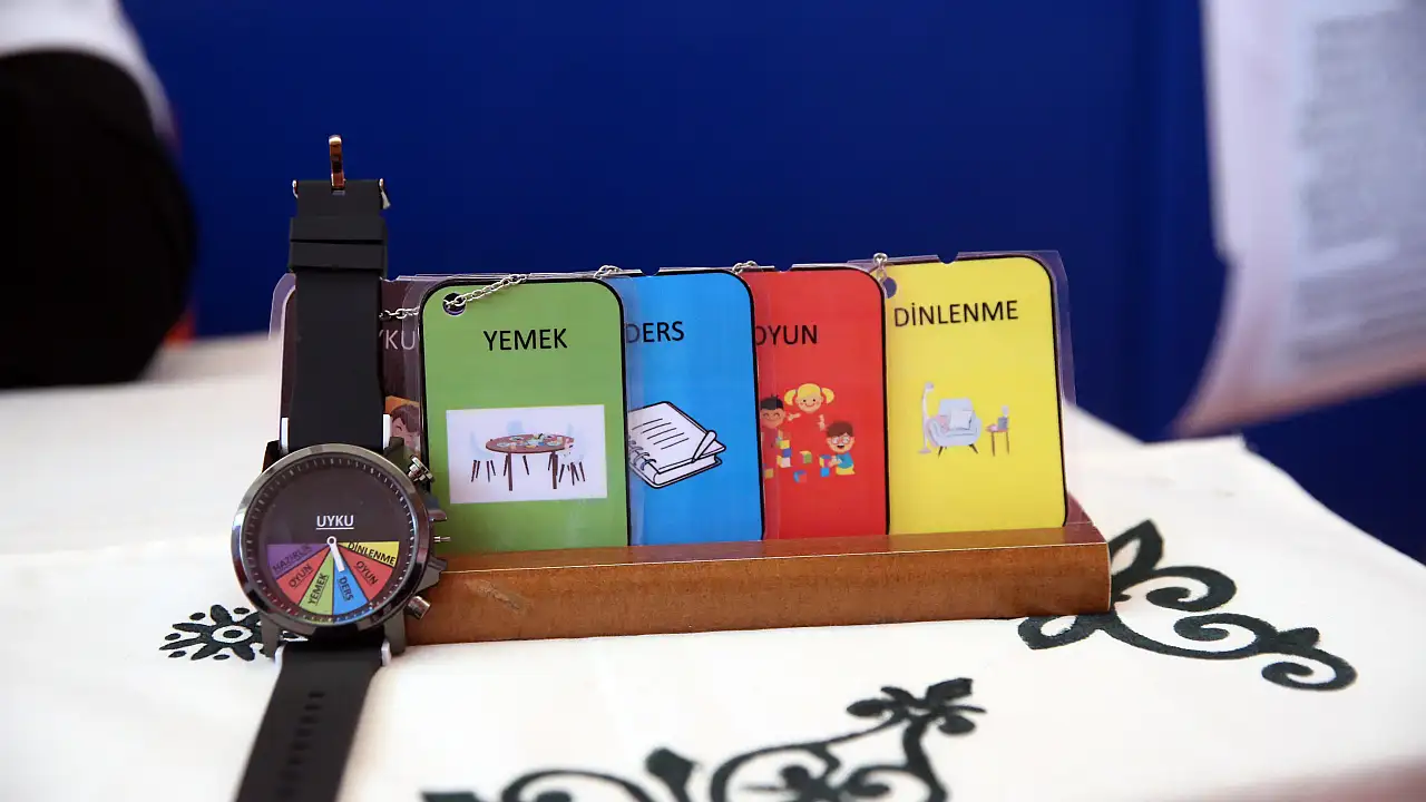 "Saatin içerisine her saat dilimi için bir renk koyalım, her saat diliminin rengi de ayrı bir eylemi temsil etsin dedik. Bu eylemler de kolye şeklinde kartlara resimlerle çizilerek yazıldı. Bu kartları da dinlenme, oyun, ders, yemek ve uyku şeklinde sınıflandırdık. Öğrenci, akrep hangi renge denk geliyorsa o rengi kendi tasarladığımız kolyedeki eylemle eşleştiriyor ve o eylemi yerine getiriyor. Bu sayede özel gereksinimli öğrenci ne ebeveyne ne de kontrole ihtiyaç duyuyor, yani biz tamamen çocuğu bağımsızlaştırmış oluyoruz."