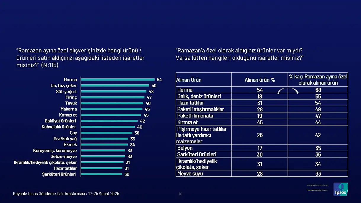 Ramazan sofralarının vazgeçilmezi olan hurma, en çok satın alınan ürün olmaya devam ediyor. Ipsos'un araştırmasına göre, yapılan her 10 hurma alışverişininin 7'si Ramazan'a özel olarak gerçekleştiriliyor. Bunun yanı sıra, balık, hazır tatlılar ve paketli atıştırmalıklar da öne çıkan ürünler arasında yer alıyor.