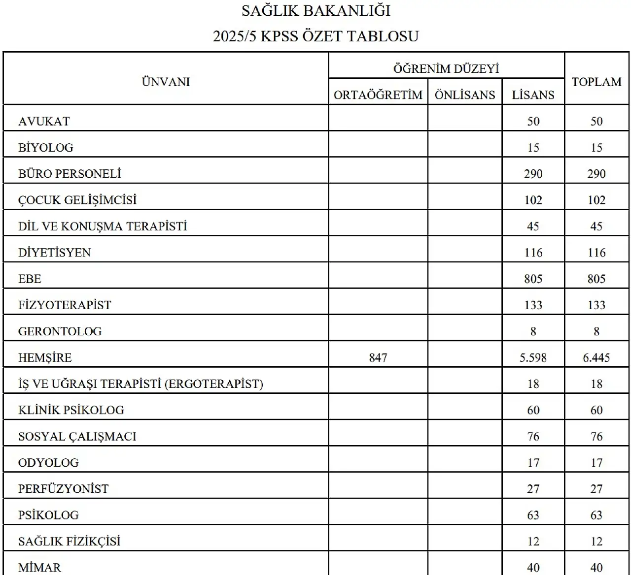 Bakanlığın açıkladığı kadro dağılımına göre, alımlarda hemşire, ebe, sağlık teknikeri, diyetisyen, fizyoterapist, psikolog, sosyal çalışmacı, tabip, uzman tabip ve teknisyen pozisyonları öne çıkıyor.