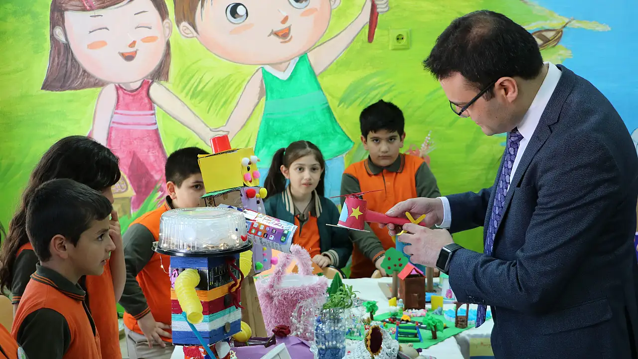 Kaymakam Çakmak, 15 Temmuz İlkokulu öğrencilerince hazırlanan geri dönüşüm sergisinin açılışını gerçekleştirdi.