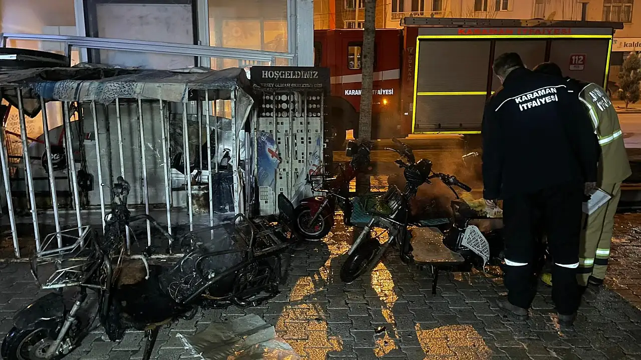 Karaman'da gece saatlerinde şarja bırakılan 3 elektrikli bisiklet, henüz bilinmeyen nedenle alev aldı. İtfaiyenin müdahalesiyle söndürülen yangında bisikletler tamamen yanarken, olayla ilgili inceleme başlatıldı.