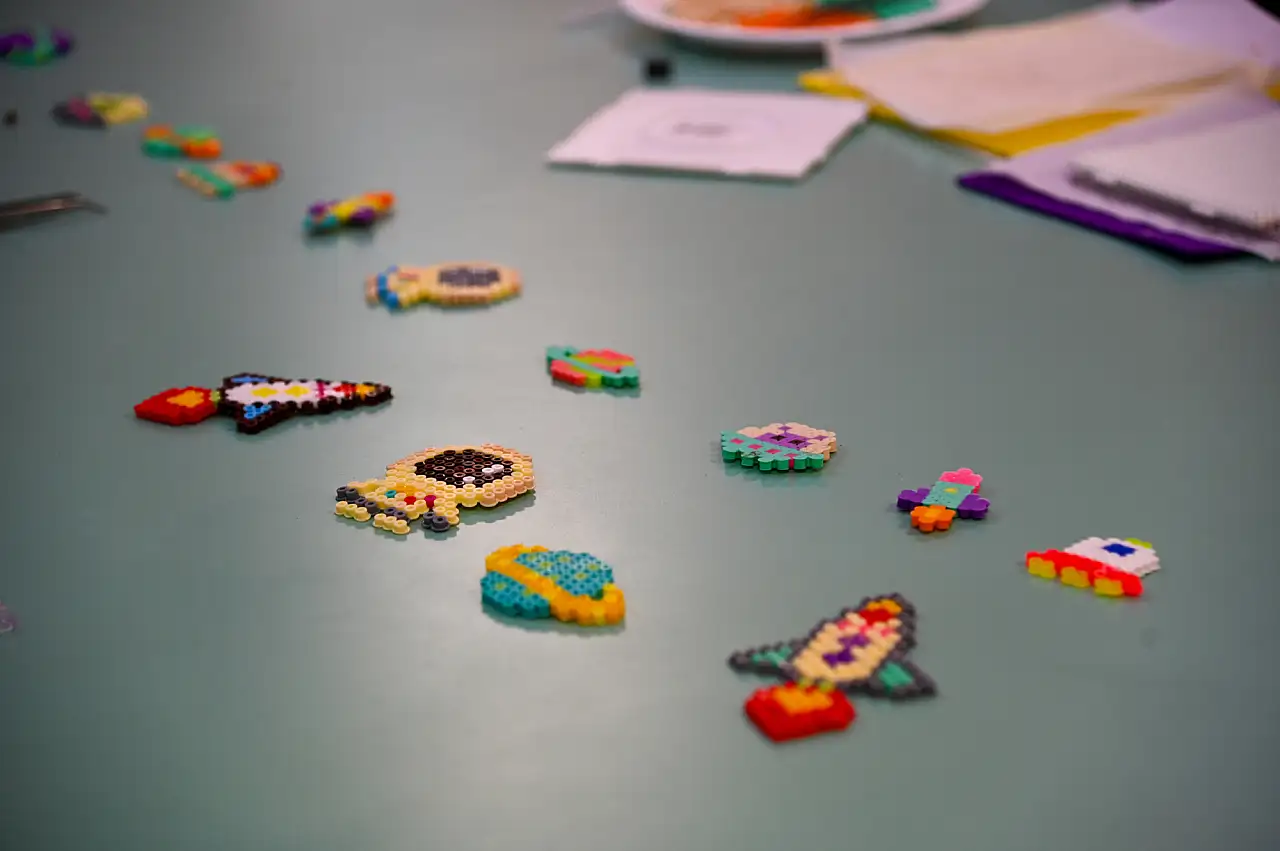 Oyuncak Üretim Atölyesi’nde minikler, hama boncuklarla uzay temalı pixel art magnetler tasarlayarak kendi özgün ürünlerini ortaya koydu. Havacılık ve Uzay Bilimleri Atölyesi’nde kağıt uçak tasarımı ve uçuş prensiplerini öğrenen öğrenciler, Lego EV3 setleriyle kağıt uçak fırlatan robotik sistemler kurdu. Mekatronik Atölyesi’nde ise çocuklar, uzay temalı parkurda görev yapan robotları kodlayarak çalıştırdı. Takı Tasarım Atölyesi’ne katılan öğrenciler ise Güneş Sistemi hakkında bilgiler edindikten sonra gezegenleri temsil eden boncuklarla kendi bilekliklerini tasarladı.