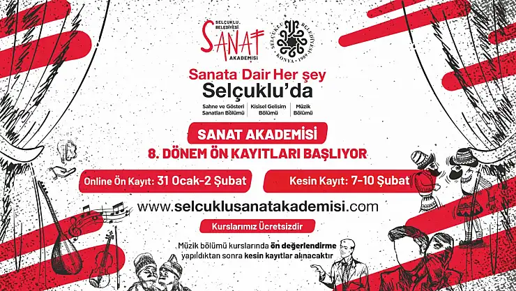 Selçuklu'da sanata açılan kapı olan Sanat Akademisi'nde ön kayıtlar 31 Ocak'ta başlıyor. 2 Şubat'ta sona erecek ön kayıtlar sonrasında kesin kayıtlar 7-10 Şubat tarihlerinde yapılacak.