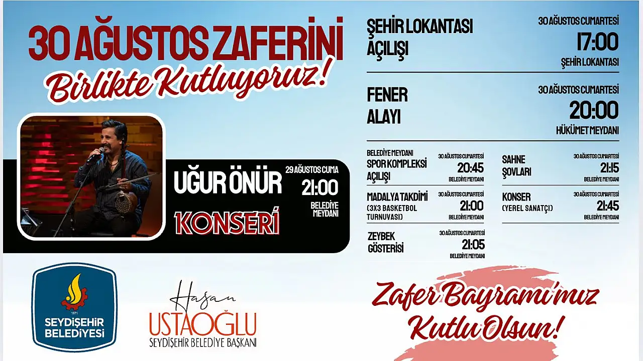 Seydişehir Belediyesi tarafından düzenlenecek 30 Ağustos Zafer Bayramı kutlama programının detayları belli oldu. Kutlamalar, 29 Ağustos Cuma akşamı saat 21.00'de Belediye Meydanı'nda gerçekleşecek Uğur Önür konseriyle başlayacak ve 30 Ağustos Cumartesi günü çeşitli etkinliklerle devam edecek.