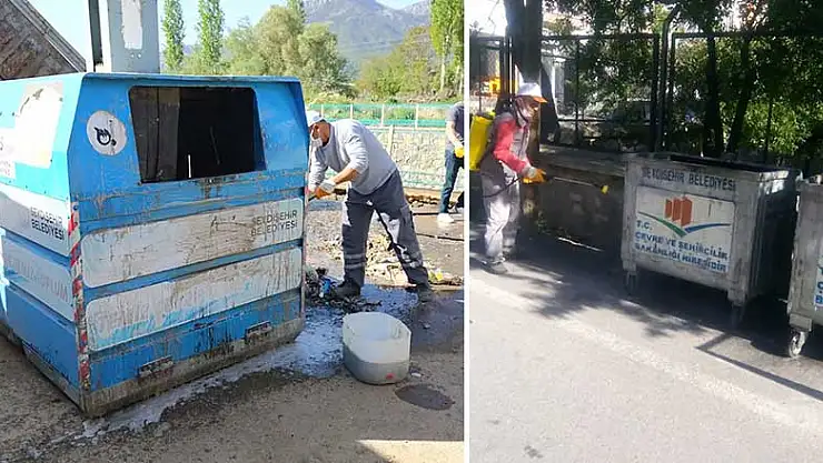 Belediye ekipler tarafından gerçekleştirilen çalışmalarda çöp konteynerleri ve tanklarının çevresi yıkanarak dezenfekte edildi.