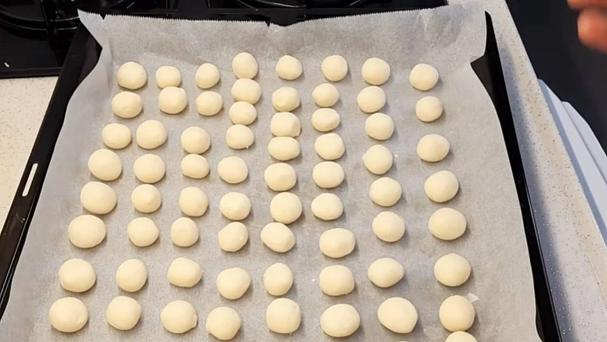 Ele yapışmayan, yumuşak kıvamlı bir hamur elde ettikten sonra hamurumuzdan parçalar alalım ve avuç içerisinde yuvarlayarak şekil verelim. Ben bu ölçülerle 30 adet kurabiye elde ettim.