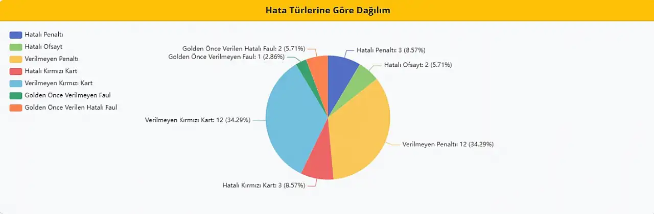 Rapora göre, en çok dikkat çeken hata türü verilmeyen penaltı ve verilmeyen kırmızı kartlar oldu. Bu kategoride tam 12 hata yapıldı ve toplam hataların yüzde 34,29'una karşılık geldi.