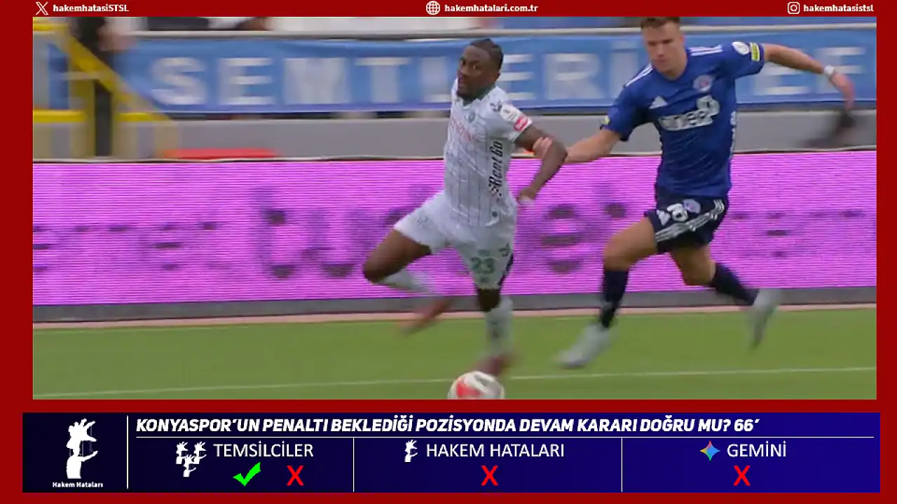 Pozisyonda Konyasporlu futbolcunun formasına yapılan ilk müdahale devam ettirilirken, oyuncunun avantajı kaybettiği anda Kasımpaşalı futbolcunun koldan çekmesi net şekilde görüldü. Hakem bu pozisyonda penaltı noktasını göstermedi. Hakemhatalari.com.tr’nin değerlendirmesine göre bu karar, Konyaspor’un lehine 3 puanlık kayba sebep oldu.