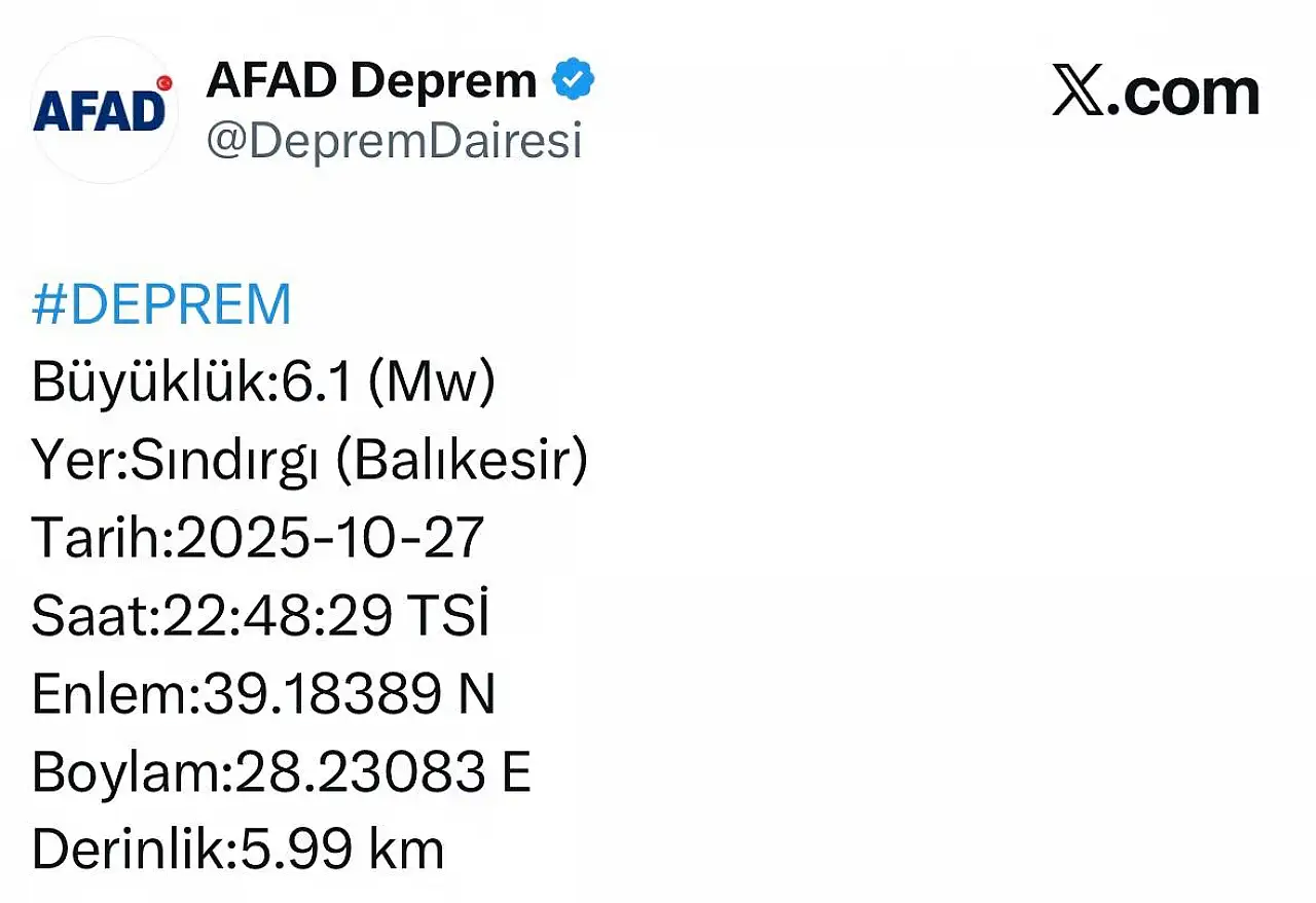 Balıkesir'de saat 22:48'de deprem meydana geldi. Afet ve Acil Durum Yönetimi Başkanlığı (AFAD), depremin büyüklüğünü 6.1 olarak açıkladı.