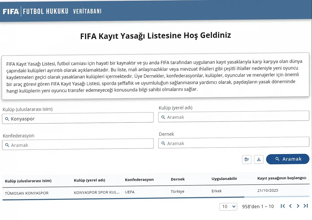 FIFA’nın futbol kamuoyuna açık şekilde paylaştığı resmi veritabanında Konyaspor’un ismi, “uygulanabilir” statüsünde listelendi. Bu karar, kulübün yeni oyuncu kaydı yapmasını geçici olarak engelliyor.