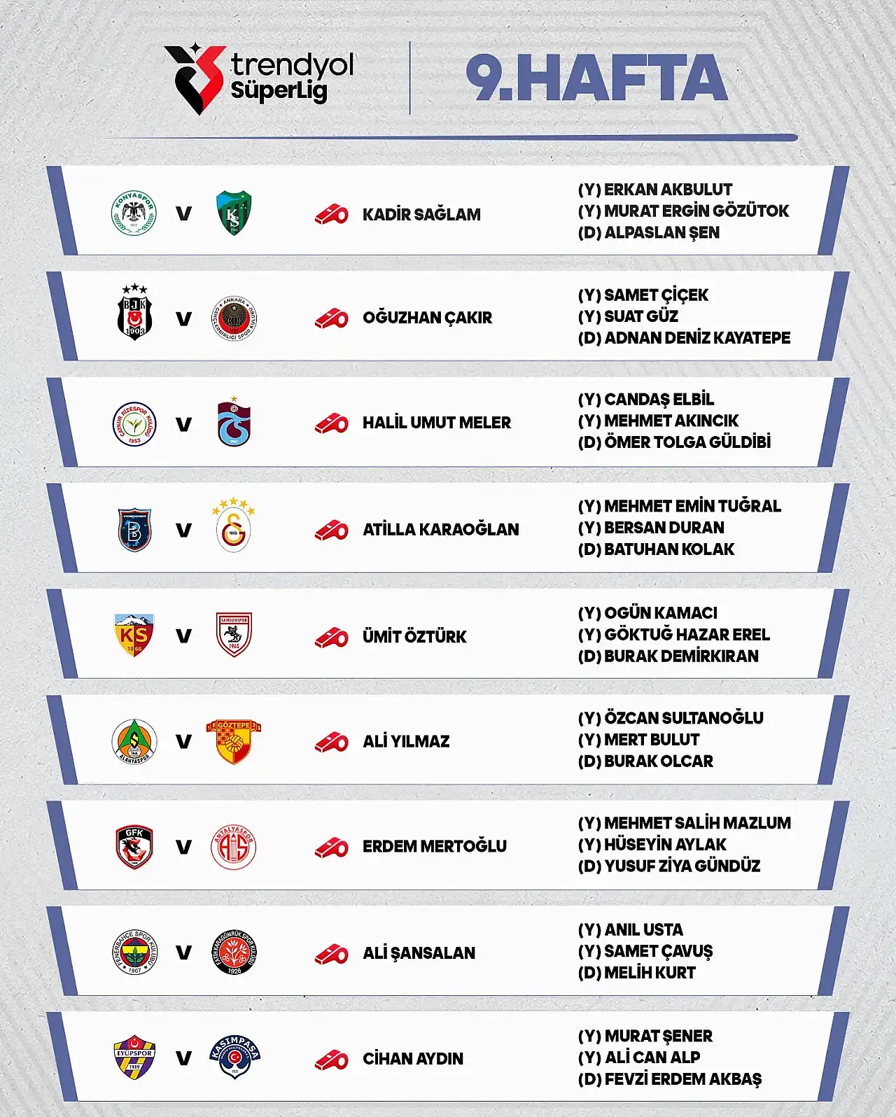 MHK, Süper Lig’in 9. haftasında görev alacak diğer hakemleri de açıkladı. Ligin zirve yarışını ve alt sıraları yakından ilgilendiren karşılaşmalarda deneyimli isimler düdük çalacak. İşte MHK açıklamasına göre, 9. hafta müsabakalarını yönetecek hakemler;
