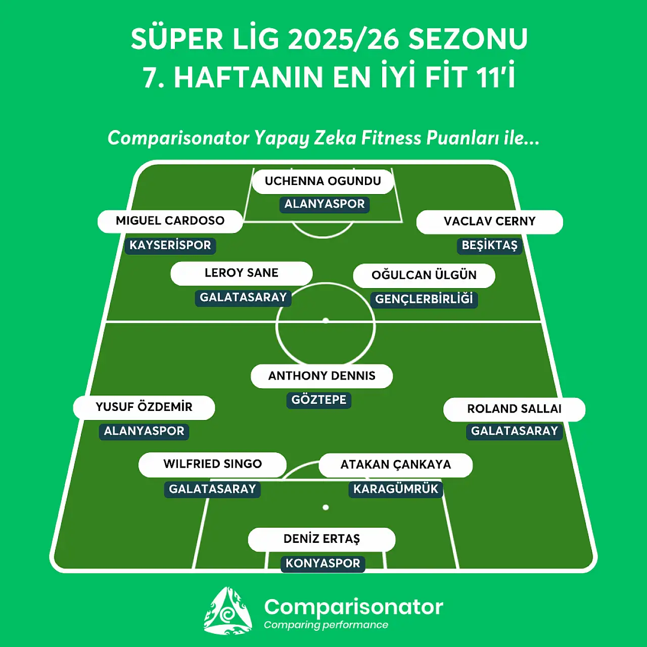 Süper Lig 2025/26 sezonu 7. haftasında Comparisonator Yapay Zeka Fitness Puanları ile belirlenen haftanın en fit 11'i açıklandı. Listede Konyaspor'un güven veren file bekçisi Deniz Ertaş da yer aldı.