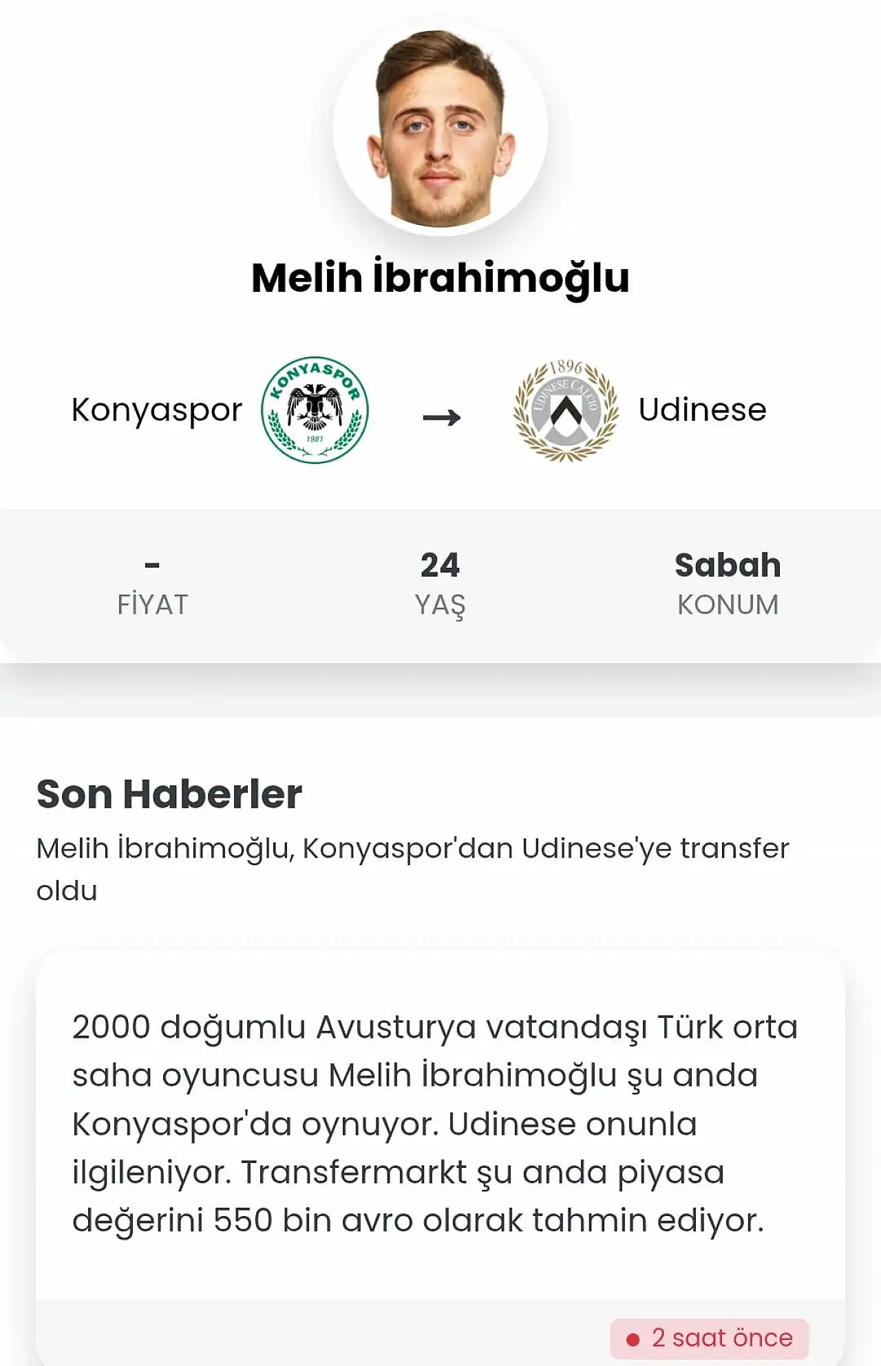 "2000 doğumlu Avusturya vatandaşı Türk orta saha oyuncusu Melih İbrahimoğlu şu anda Konyaspor'da oynuyor. Udinese onunla ilgileniyor. Transfermarkt şu anda piyasa değerini 550 bin avro olarak tahmin ediyor."