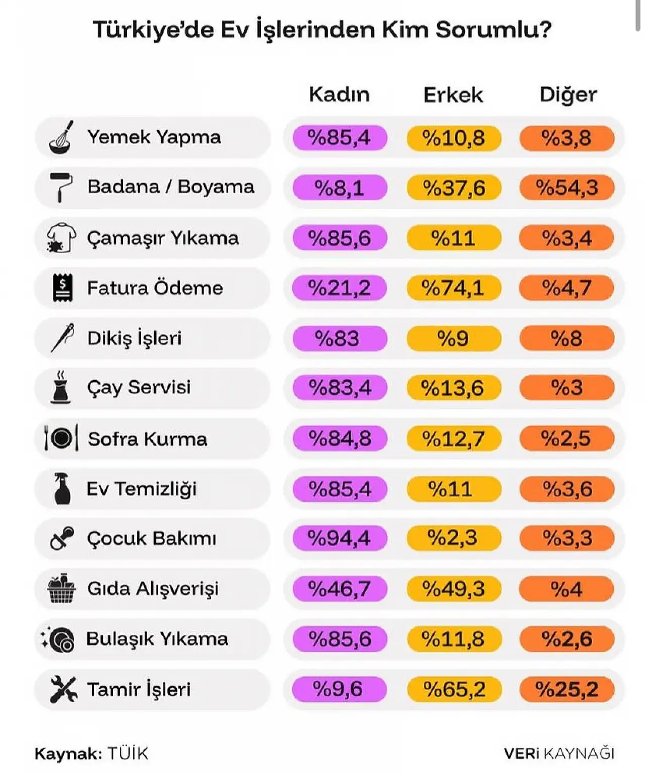 TÜİK Aile Yapısı Araştırma'sına göre ev işlerinde hala büyük oranda kadınlar sorumlu. Yemek yapmadan çocuk bakımına kadar birçok işte kadınların üstlendiği rol açıkça görülüyor. Erkekler ise daha çok badana ve tamir işlerinde sorumluluk alıyor.