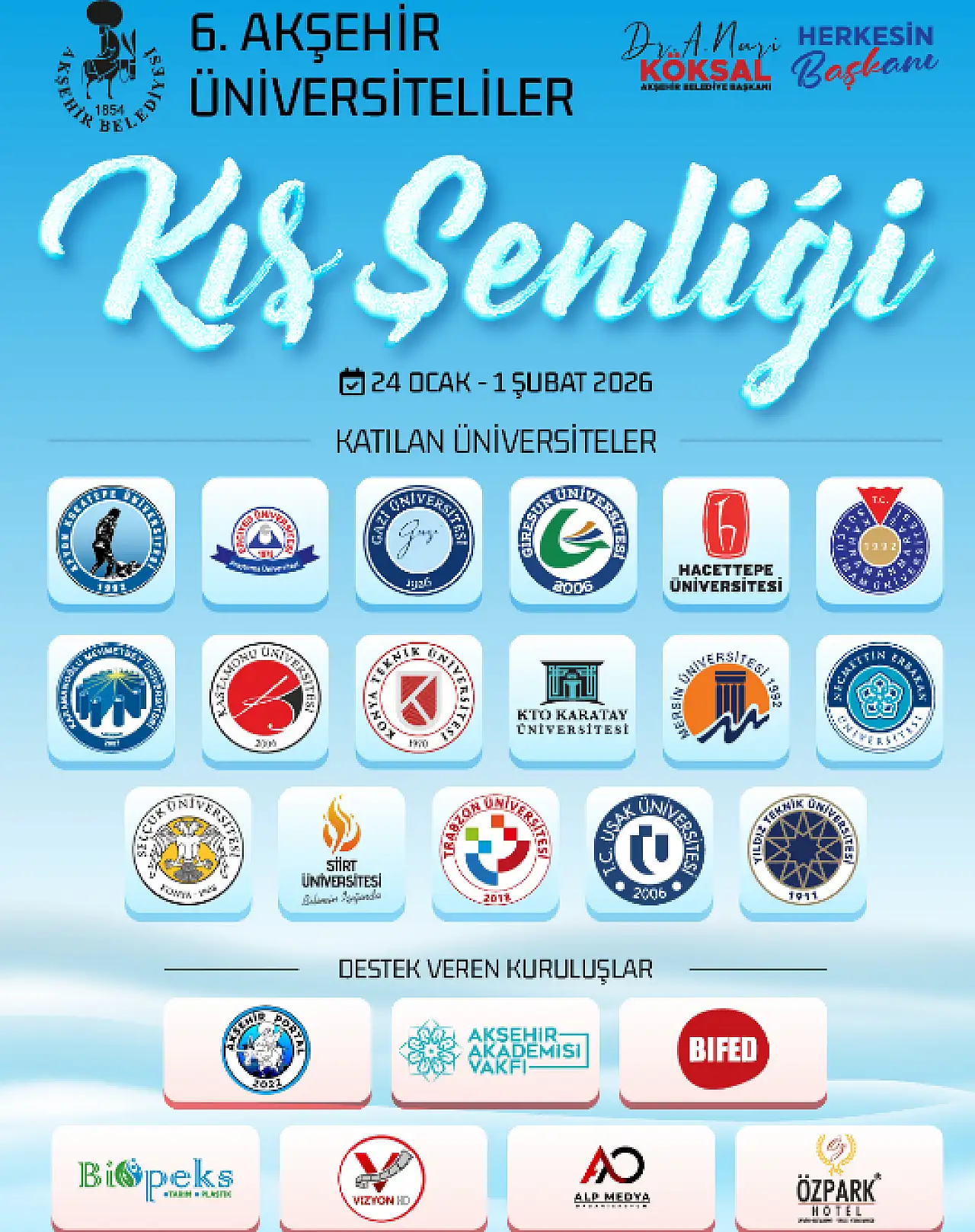 Akşehir, uzun bir aranın ardından yeniden üniversite gençliğinin enerjisiyle dolup taşmaya hazırlanıyor. Akşehir Belediyesi ile paydaş kurum ve kuruluşların iş birliğinde düzenlenen 6. Akşehir Üniversiteliler Kış Şenliği, 21 yıllık aranın ardından yeniden hayat buluyor. 24 Ocak – 1 Şubat 2026 tarihleri arasında gerçekleştirilecek şenlikte, Türkiye'nin dört bir yanından 17 üniversite Akşehir'de bir araya gelecek.