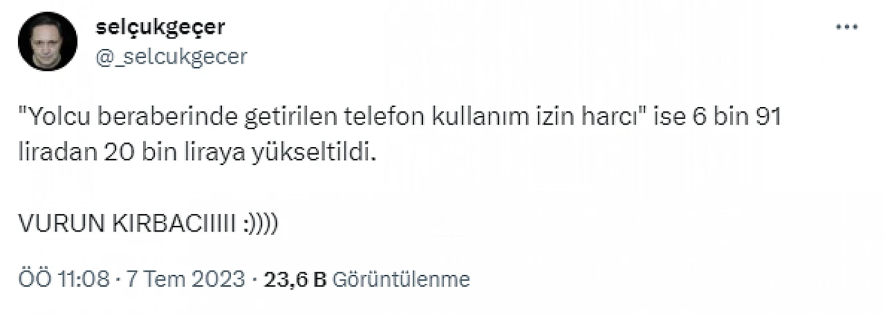 Geceden beri vergilere gelen zamlara tepkiler dinmiyor. Kişisel sosyal medya hesabından zamlar ile ilgili paylaşım yapan Ekonomist Selçuk Geçer, "’Yolcu beraberinde getirilen telefon kullanım izin harcı’ ise 6 bin 91 liradan 20 bin liraya yükseltildi. VURUN KIRBACIIIII :))))” ifadelerini kullandı.