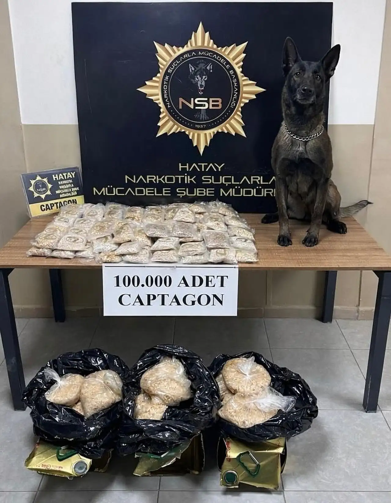 Hatay İl Emniyet Müdürlüğü’ne bağlı Kırıkhan Narkotik Suçlarla Mücadele Büro Amirliği ekipleri tarafından durdurulan araçta, narkotik dedektör köpeği eşliğinde arama yapıldı. Aramada, zeytinyağı tenekeleri içerisinde gizlenmiş halde toplam 100 bin adet captagon hap bulundu.