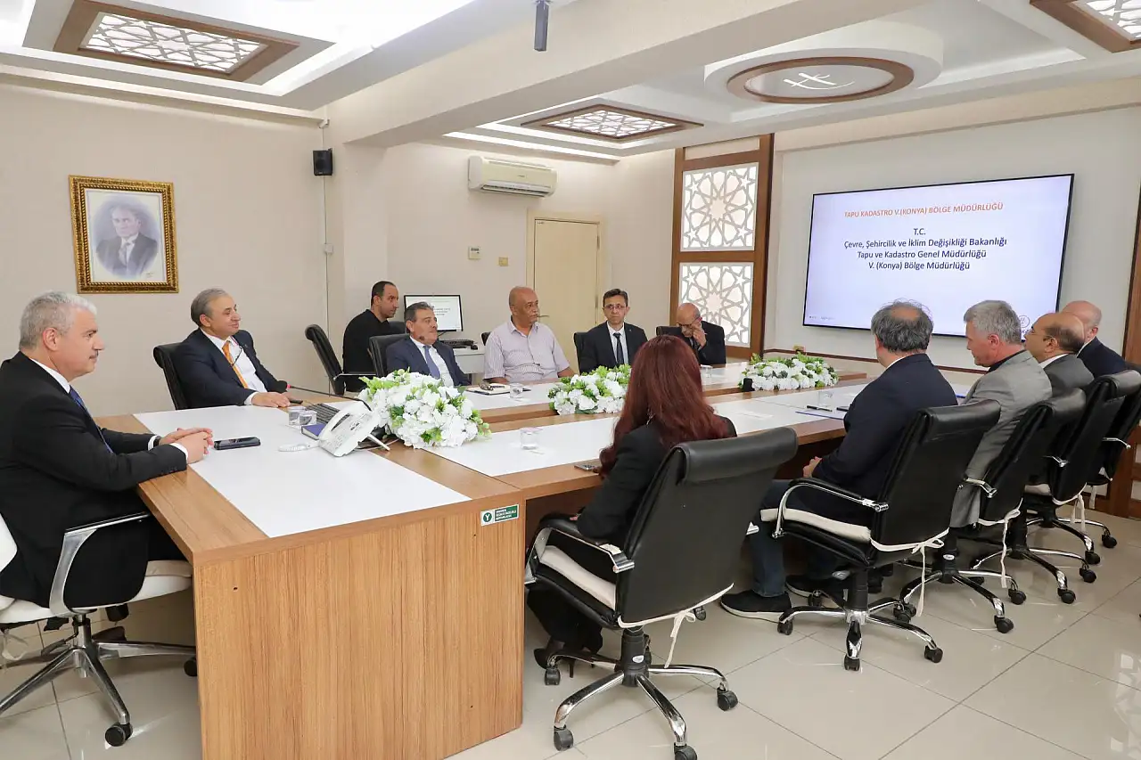 Konya Tapu ve Kadastro V. Bölge Müdürlüğü ziyareti kapsamında Vali İbrahim Akın başkanlığında; Vali Yardımcısı Fatmagül Dalmış, Konya Tapu ve Kadastro V. Bölge Müdürü Ömer Ay, merkez ilçe tapu müdürleri ve şube müdürleri ile kurumun ilimizdeki faaliyetleri hakkında bir değerlendirme toplantısı gerçekleştirildi.