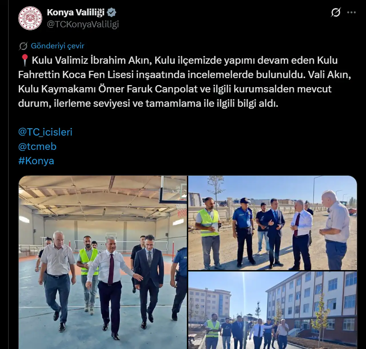 Konya Valiliği sosyal medya hesabından yaptığı açıklamada; “Valimiz İbrahim Akın, Kulu ilçemizde yapımı devam eden Kulu Fahrettin Koca Fen Lisesi inşaatında incelemelerde bulundu. Vali Akın, Kulu Kaymakamı Ömer Faruk Canpolat ve ilgili yetkililerden projenin mevcut durumu, ilerleme seviyesi ve tamamlama sürecine ilişkin bilgi aldı.” ifadelerine yer verdi.