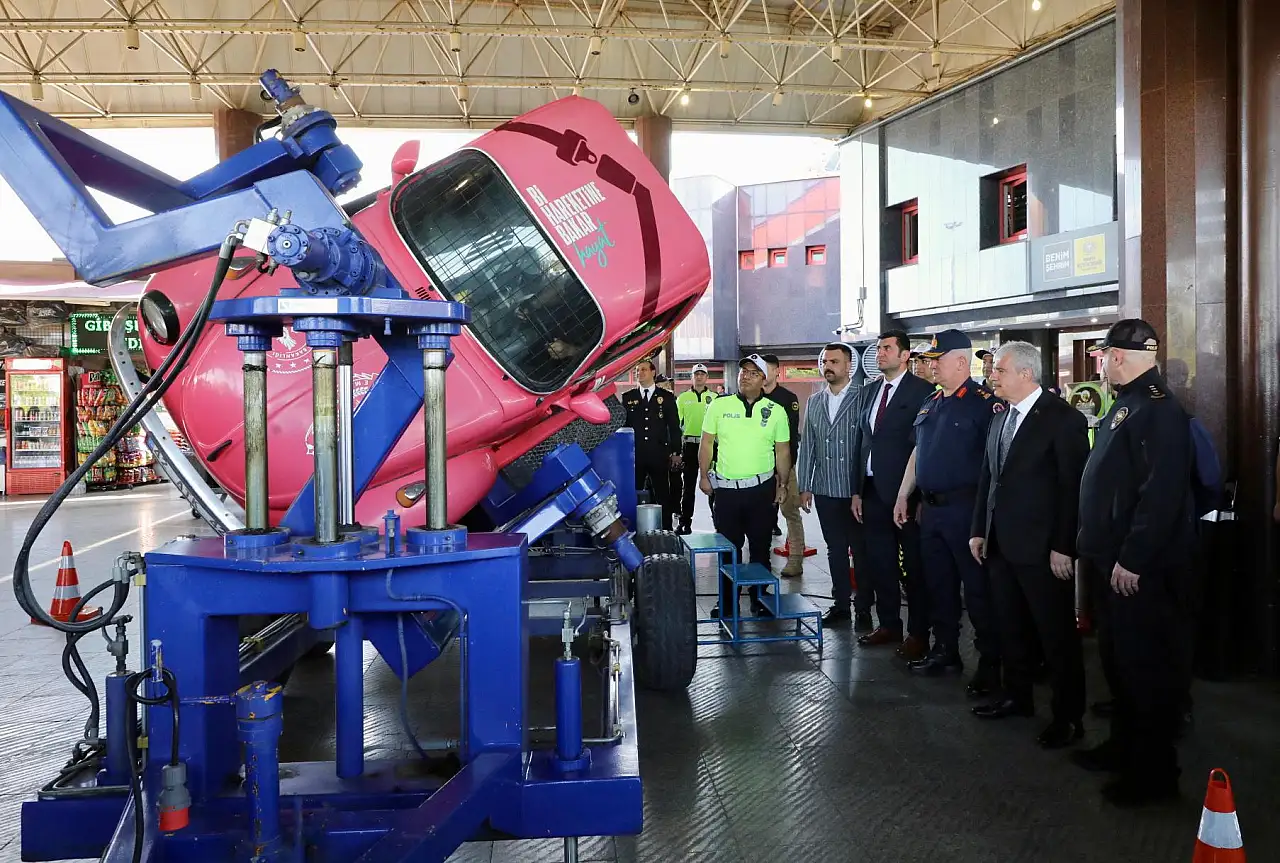 İl Emniyet Müdürlüğü tarafından terminal alanına kurulan emniyet kemeri simülasyon aracı ile hem seyahat edecek yolculara hem de otobüs kaptanlarına emniyet kemerinin önemi uygulamalı olarak gösterildi.