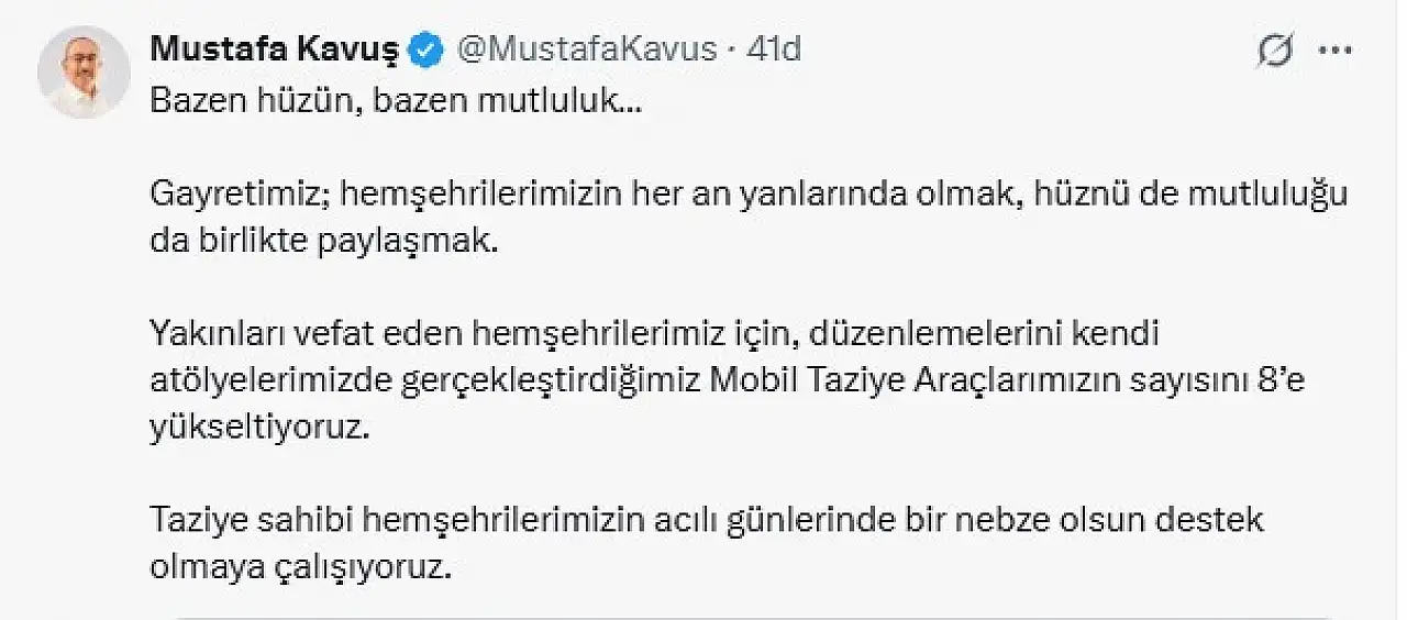Başkan Mustafa Kavuş sosyal medya hesabından yaptığı açıklamada, “Bazen hüzün, bazen mutluluk… Gayretimiz; hemşehrilerimizin her an yanlarında olmak, hüznü de mutluluğu da birlikte paylaşmak.” ifadelerine yer verdi.