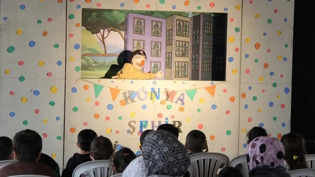 Konya Büyükşehir Belediyesi Şehir Tiyatrosu ile Masal Sahnem Kukla Tiyatrosu oyuncuları 'Penceredeki Kuş ve Karagöz'ün Dedektifliği' isimli kukla oyunuyla ilkokul öğrencilerine müzikal oyun sahnelendi.
