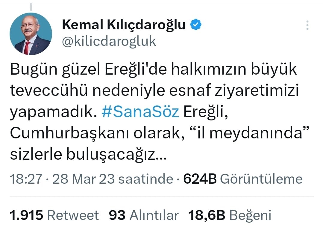 Millet İttifakının Cumhurbaşkanı adayı Kemal Kılıçdaroğlu, 28 Mart 2023 tarihinde Cumhuriyet Halk Partisi grup toplantısını Ereğli Kapalı Spor Salonunda gerçekleştirdi. Toplantı için başka şehirlerden taşınan kimse olmamasına karşın katılım hayli yüksekti. Grup toplantısının ardından şehir merkezinde esnaf ziyaretine geçildi. Şehir merkezinde Kılıçdaroğlu’na gösterilen teveccüh grup toplantısından daha yoğun oldu. Ereğlililerin yoğun ilgi göstermesi üzerine kalabalık halkın arasında, aracından kısa bir teşekkür konuşması gerçekleştirdi ve izdihama neden olmamak için esnaf ziyaretini iptal etmek durumunda kaldı.