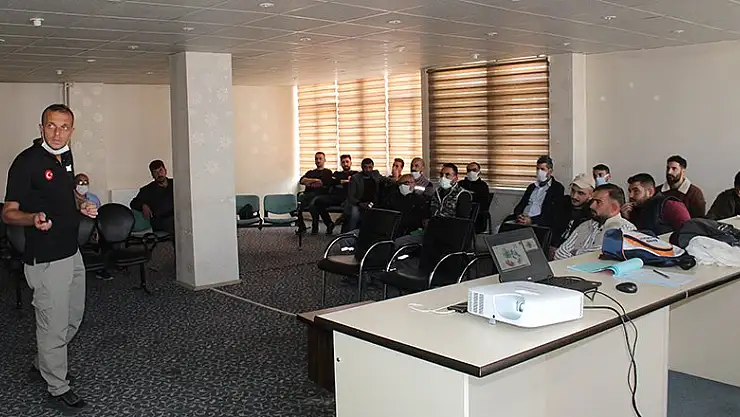 Yunak Belediye Başkanlığı toplantı salonunda düzenlenen eğitimde İl Afet ve Acil Durum Müdürlüğünde görevli arama kurtarma teknisyeni Serdar Gencer, sunum yaptı.