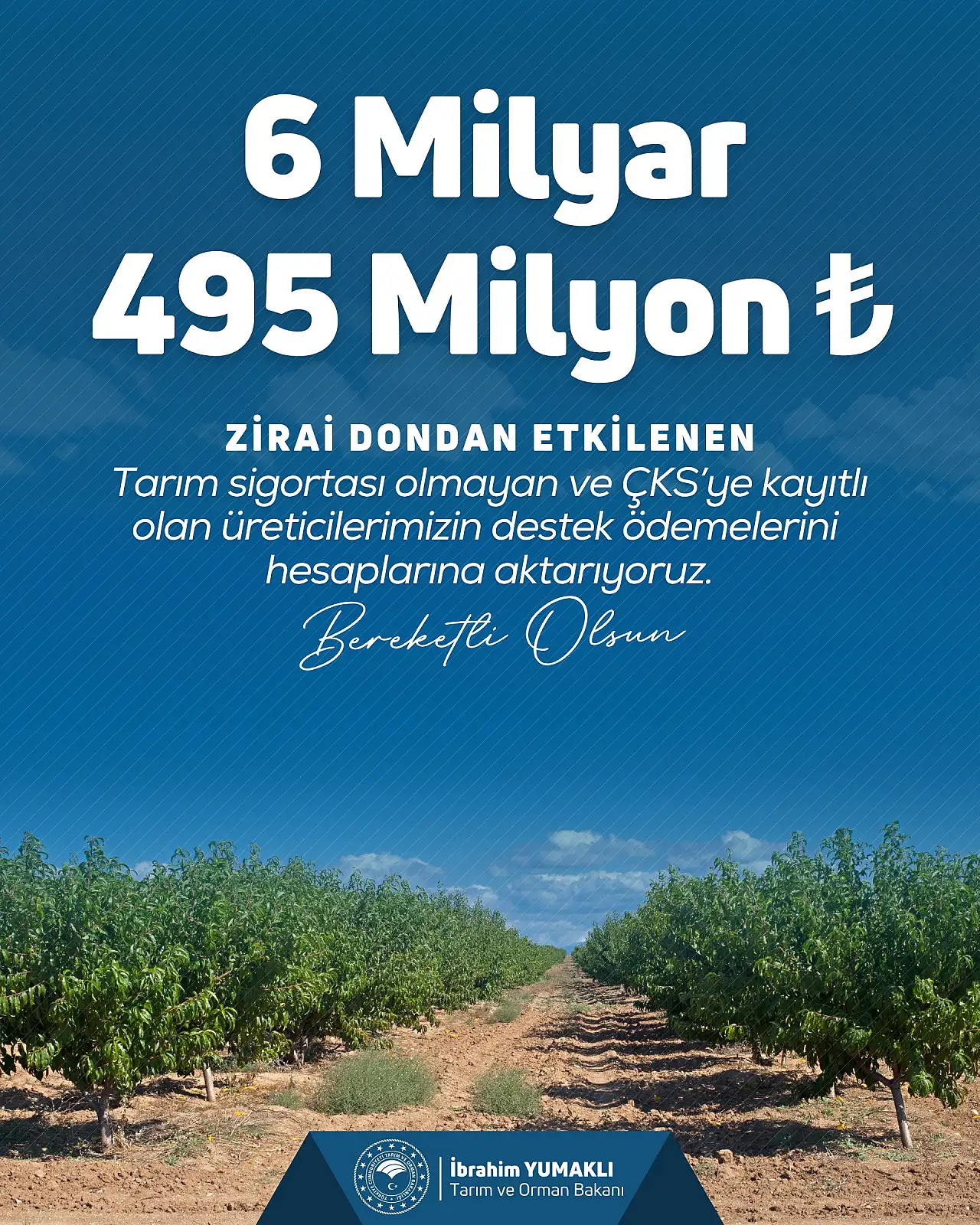Zirai dondan etkilenen üreticilerinin yanında olmaya devam ettiklerini belirten İbrahim Yumaklı, “Tarım sigortası bulunmayan, Çiftçi Kayıt Sistemi’ne (ÇKS) kayıtlı üreticilerimize önceki ödemelerin devamı olarak 6 milyar 495 milyon TL daha aktarıyoruz.” ifadelerini kullandı.